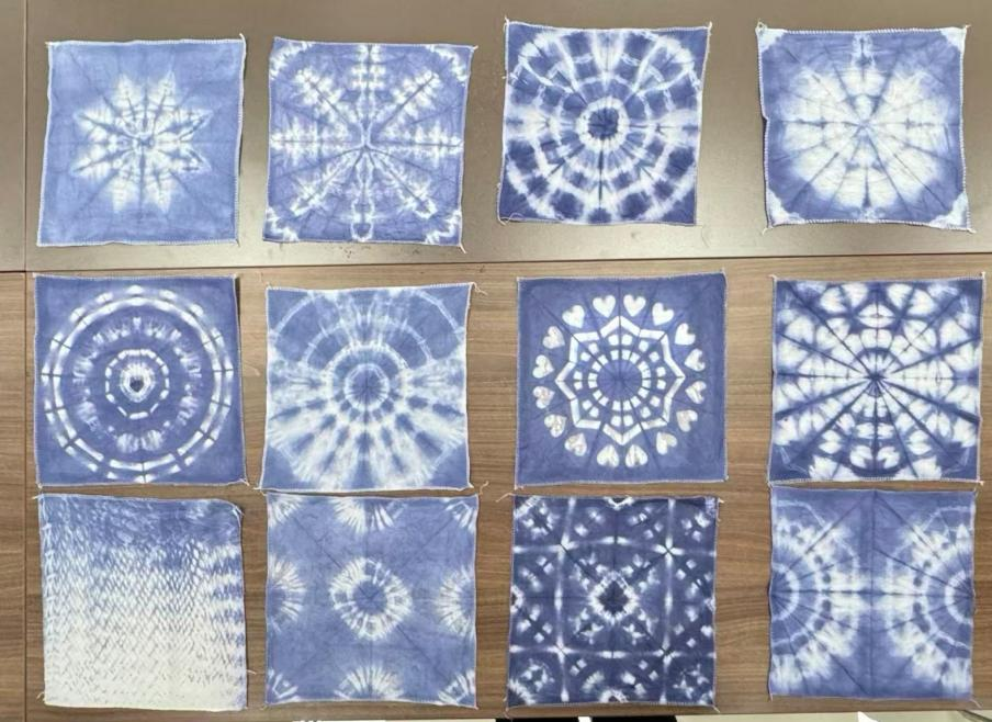 待染色固色完成,皮筋与夹子逐一解开,雪花、爱心、几何等形态各异的精美图案渐次呈现,解锁纹样的惊喜感让大家纷纷赞叹,脸上洋溢着轻松愉悦的笑容。每一件独一无二的作品都承载着创作者的巧思与心意,也让大家切实体会到扎染“一物一纹”的神奇魅力。