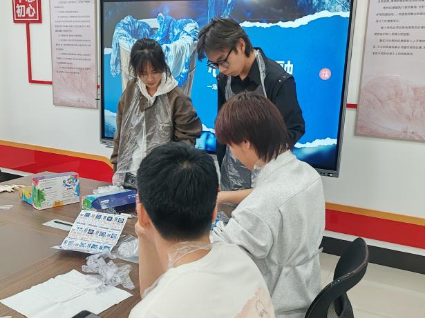 活动伊始,大家共同学习扎染技巧,借助皮筋、夹子等工具进行折叠、缠绕与固定,认真构思纹样、相互交流创意,释放压力、舒缓心情,沉浸式感受传统手工艺的创作乐趣。